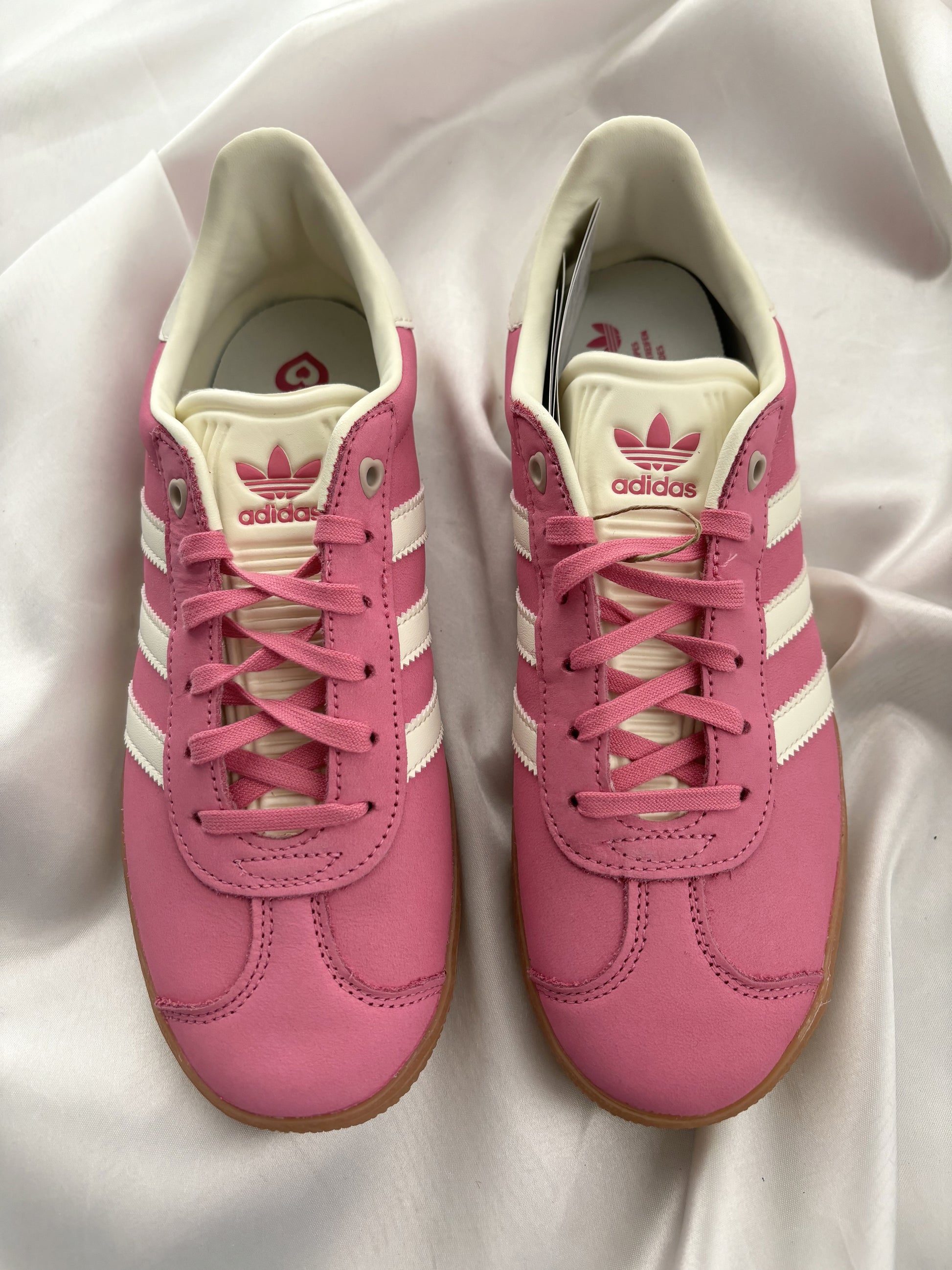 Le adidas Gazelle Pink Fusion (SKU ID1107) sono un classico delle sneakers e dello streetwear, sono realizzate in pelle pregiata e sono disponibili in una colorway bianca e rosa. Le sneakers presentano le tre iconiche strisce dentellate che identificano il marchio, oltre al trifoglio dorato con la scritta gazelle e al logo Adidas sulla linguetta pieghevole. Hanno lacci rosa e una suola colore gum.