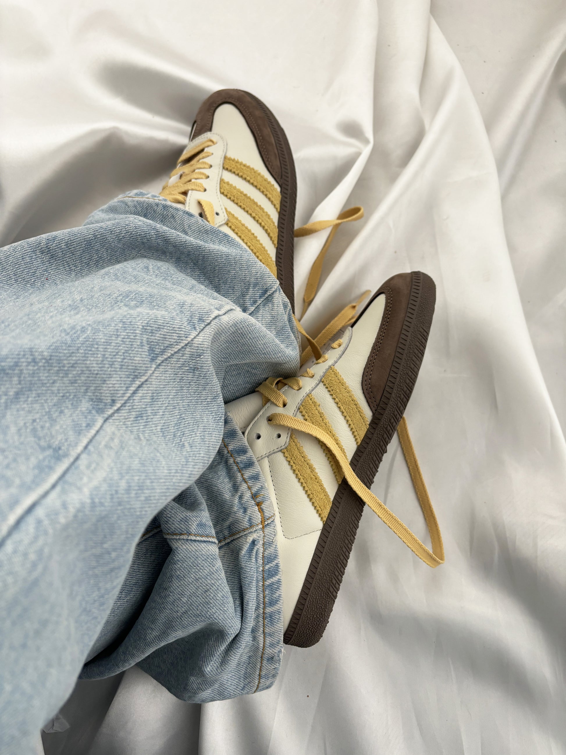 Si presentano in una colorway avorio violetto e marrone, le tre iconiche strisce questa volta in giallo scamosciato identificano il marchio, oltre al trifoglio dorato con la scritta gazelle e al logo Adidas sulla linguetta pieghevole. Hanno lacci gialli (e marroni supplementari) e una suola colore marrone che riprende la punta dello stesso colore ma in pelle scamosciata.
