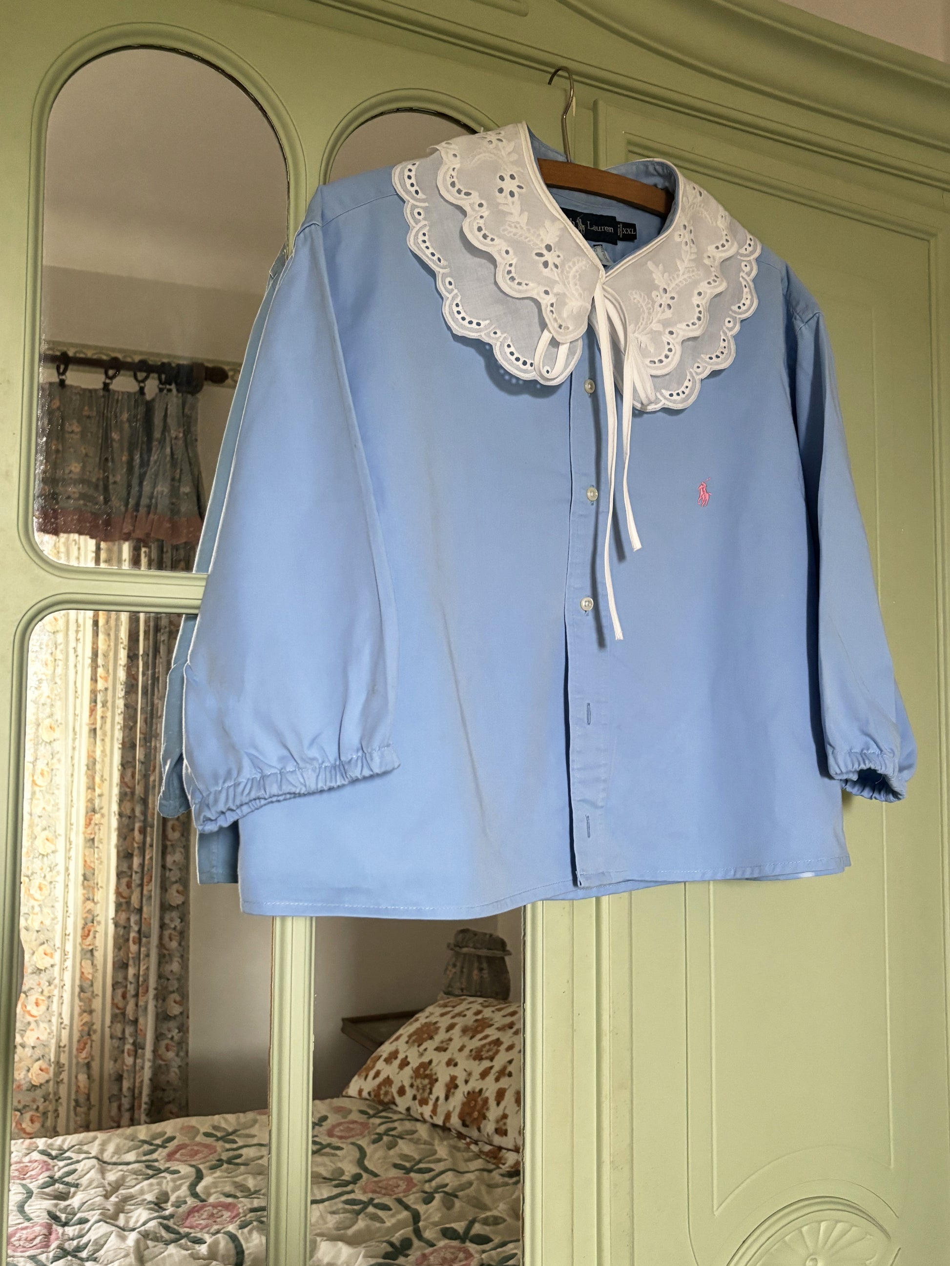 Questa camicia Ralph Lauren ideata dal nostro shop, è un capo particolarissimo di un azzurro tenue in contrasto con l'ampio colletto bianco, il colletto è impreziosito da un ricamo in San Gallo che rende il capo adatto ad ogni occasione. Il modello a campana con maniche leggermente a sbuffo rende l'indumento comodo e versatile.